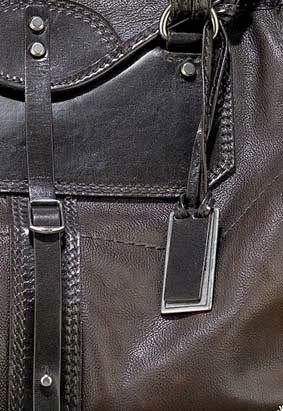 With a front flap and buckled extended tab and an ID tag, inside lined with suede and added with zip and slide pockets.