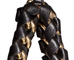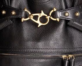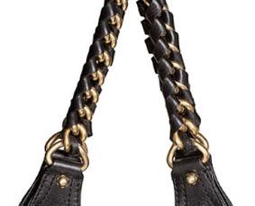 Medium shiny leather handbag with magnetic close and lobster claw clasp. Leather and chain handles and large front zipper pocket. Gold-toned hardware. Fabric lined interior with side zip pocket and two multi-functional pockets.