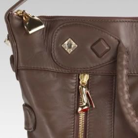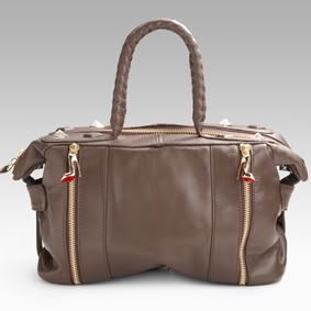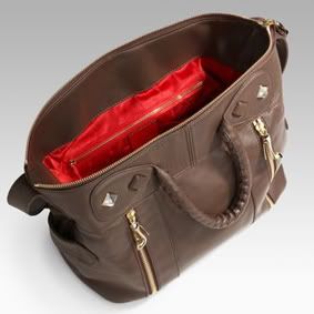 Classic leather duffle updated with stud detail. Double top handle and adjustable strap, 5" and 9" drop, top zip closure, two exterior zip pockets, two interior zip pockets and one phone holder, nylon lining