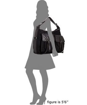 Black / Dark Brown signature woven nylon with pebbled leather trim and brushed pewter tone hardware, dual whipstitched, studded flap pockets with buckle strap and drawstring closure, classic insignia at center front, magnetic snap closure, buckle adjustable 18'' shoulder strap with 9'' drop, bogo jacquard lining with zip pocket