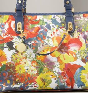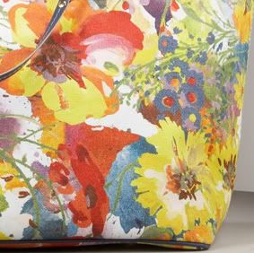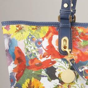 Bright floral-print canvas with coated finish, blue faux-leather trim, gold-tone hardware, shoulder straps with clasp detail.