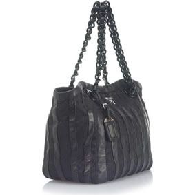 Architectural lines meet high fashion with this modern Prada handbag. In striped black nylon and leather with a black lucite chain, this tote positively smolders. Black hardware, the signature logo and a luggage tap completes the look. The snap closure opens to reveal a black nylon interior with two interior zip pockets.