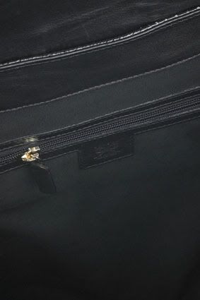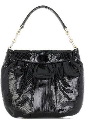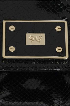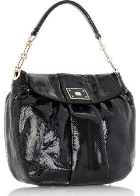 Black python shiny slouch shoulder bag with gold hardware. Anya Hindmarch bag has a designer embossed plaque on flap closure, a single strap across top with links securing it to bag, a concealed magnetic fastening to close, feet on base, a zip compartment and a pouch pocket internally and is fully lined