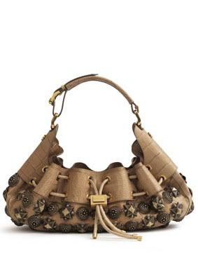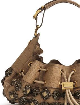 The Luxury Warrior bag as featured in the runway show is made from alligator skin and has polished brass medal stud detailing, a drawstring closure and panels around the top. Chunky cube toggle engraved with trademark logo. Single strap with belt and buckle detail. Interior has three compartments with a central zip up compartment and two magnetic closures on either side. Central compartment has an interior zip pocket and two patch pockets. Lining with tonal equestrian knight emblem