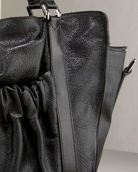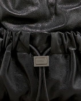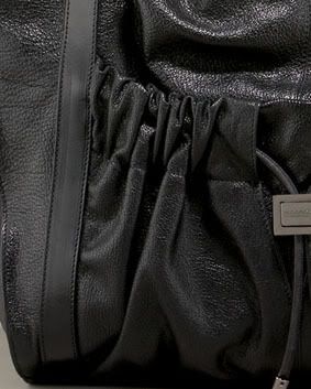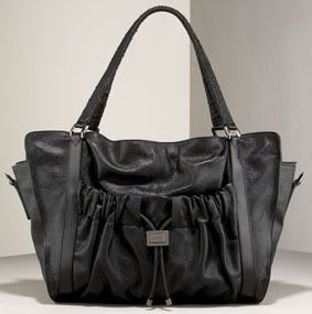 Choose black or goldstone Italian leather, goldtone hardware, top handles with square rings; shoulder strap, belted body, front logo plate