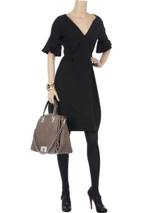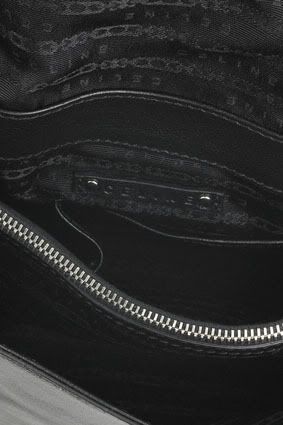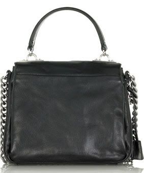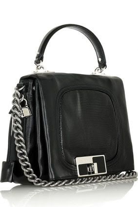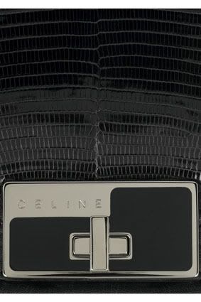 Black leather shoulder bag with silver hardware. Celine bag has a faux lizard panel on front, a chain link shoulder strap, a turn-lock fastening on front, a handle on top and satin lining