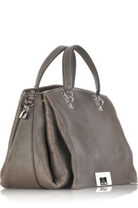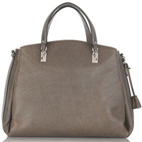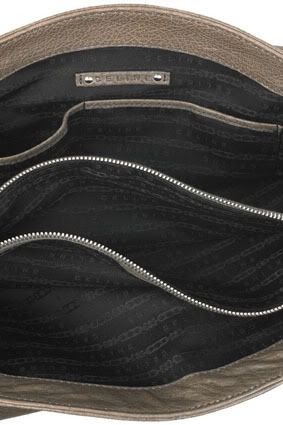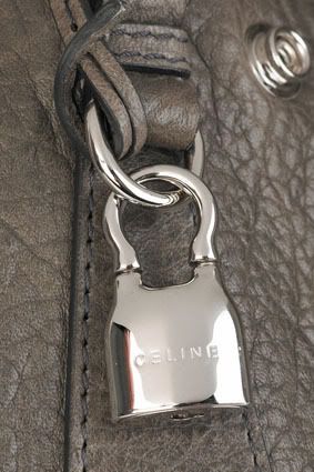Steel grained leather shoulder bag with silver hardware. Celine bag has a large flap pocket on front with clasp fastening, a detachable chain link shoulder strap across top, a handle on each side, two large compartments on each side and a zip fastening section in middle