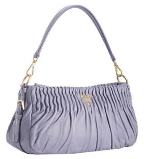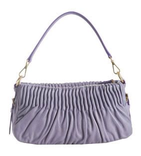 Lavender supple and pleated leather with brushed gold-tone hardware, logo lettering along front, buckle detail along sides, top zip closure, 13'' shoulder strap with 5'' drop, logo jacquard lining with interior zip pocket