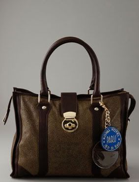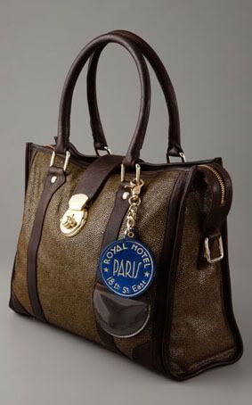 Stingray-embossed leather handbag with contrast banding throughout and welt pocket at back. 2 embroidered, detachable medallions with 'Royal Hotel Paris' and 'French Line S.S. Minkoff' lettering. Gold hardware. Double rolled handles and detachable shoulder strap. Lock closure at front flap and zipper closure at main compartment. Lined interior features zipper pocket and 2 patch pockets