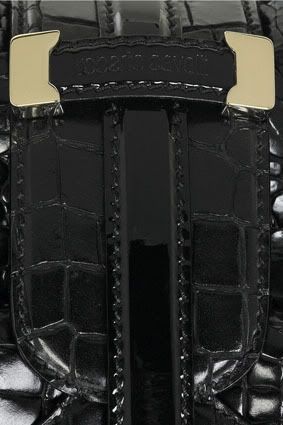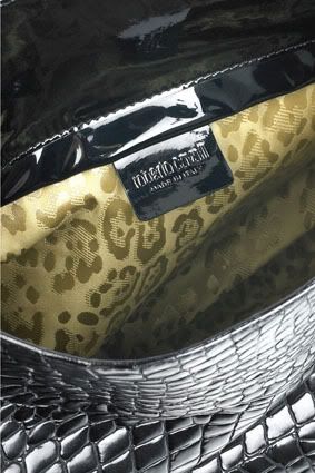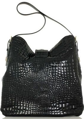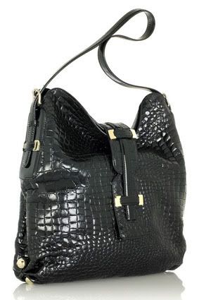Black stamped leather hobo bag with gold hardware and an adjustable shoulder strap. Roberto Cavalli bag has patent detailing, a flap closure across top with magnetic fastening, ruched sides and leopard print lining