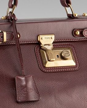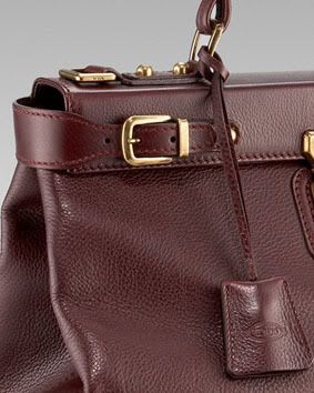 Berry smooth leather. Single top handle; long shoulder strap. Fold-over top with clasp closure. Interior zip pocket