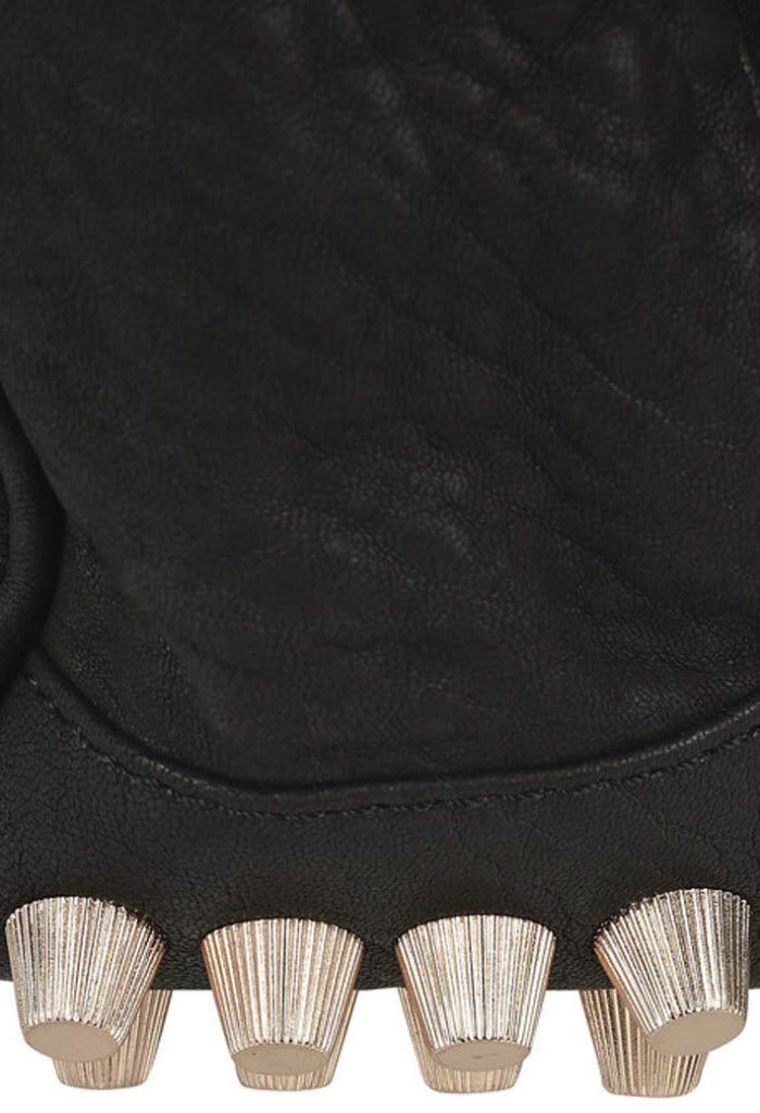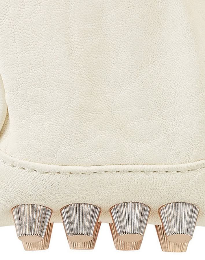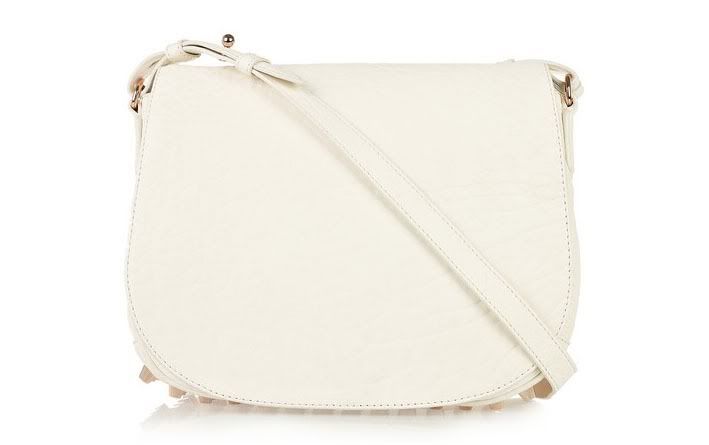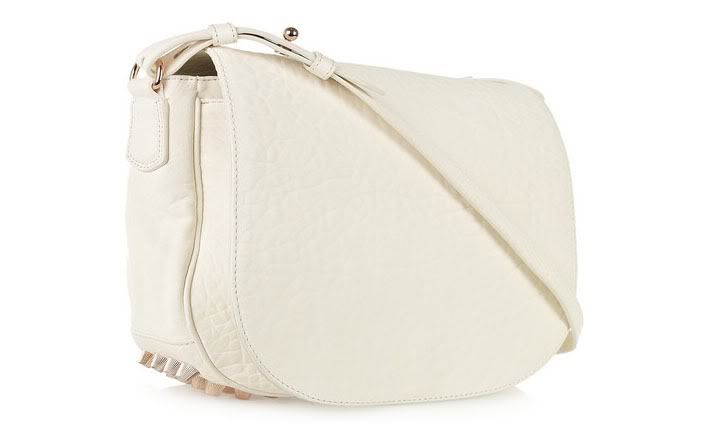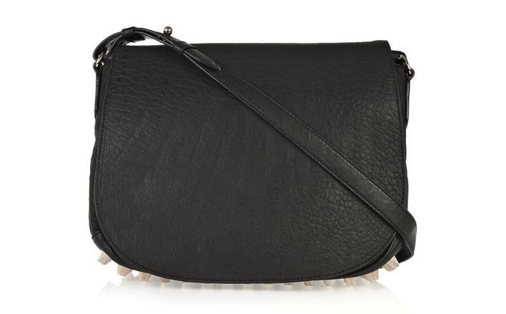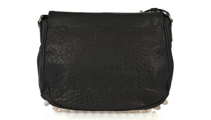 Eggshell textured leather messenger bag with rose gold stud detailing at base. Alexander Wang bag has an adjustable shoulder strap with padding at top, a concealed magnetic fastening at fold-over flap, a pouch pocket underneath flap, an internal compartment with a zip-fastening pocket, a magnetic-fastening pouch pocket at back and is fully lined in black twill