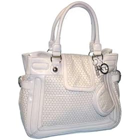 Roomy, spacious...the perfect stylish excursion bag by Chinese Laundry! Whether you're traveling, or just like to carry a lot with you, this ultra-hip white tote bag will add an extra fashionable accessory to any wardrobe. Features a perforated soft pleather pattern on top closure and sides, patent pleather trimming, silver side buckles, accented large silver studs, large side zipper, large pleather snap band closure, attached matching coin pouch, and silver Chinese Laundry keychain emblem. Interior features three compartments; two large open pockets, large center zipper pocket, side zipper, and two cell pockets. Measurements: Size: 15"(L) x 12"(H) x 6"(D) Shoulder Drop: 8"