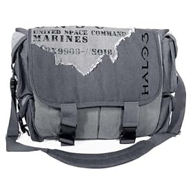 Material: canvas Size: 16"W x 14"H x 4"D Features Black and gray 16 oz heavyweight canvas messenger with UNSC screenprint. Features 2 exterior compartments, snap closure and detail on side pocket. Measures 16"W x 14"H x 4"D; adjustable shoulder strap.