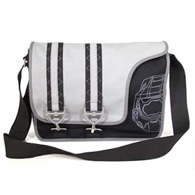 Material: canvas Size: 14"W x 12"H x 4"D Features Black and gray 16 oz heavyweight canvas messenger with Master Chief screenprint. Features two exterior compartments. Measures 14"W x 12"H x 4"D; adjustable shoulder strap.