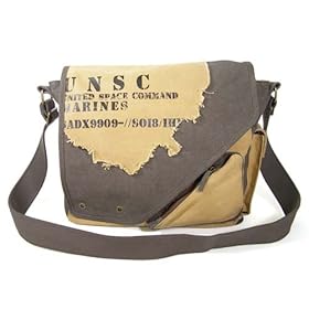 Material: canvas Size: 16"W x 14"H x 4"D Features Brown and tan 16 oz heavyweight canvas messenger with UNSC screenprint. Features 2 exterior compartments, snap closure and detail on side pocket. Measures 16"W x 14"H x 4"D; adjustable shoulder strap.