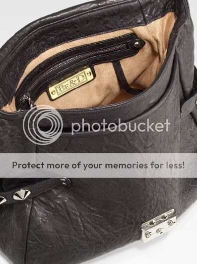 Glamorous and tough, this textured, washed lambskin leather design has silvertone hardware including chain-link handles and studs, chain-link handles with leather shoulder pads, 13" drop, pushlock closure, outside back zipper pocket, inside cell phone, PDA and zipper wall pockets, ultrasuede/leather lining